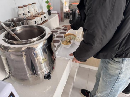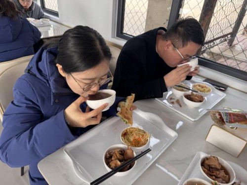 中午時分,食堂窗口前排起長隊。紅棗、紅豆、花生米、蓮子、糯米等十余種食材經(jīng)過數(shù)小時熬煮,化作一碗碗熱氣騰騰的臘八粥迎接員工的到來。廚師們將臘八粥盛到每位員工碗中,員工們接過粥碗,笑容洋溢。